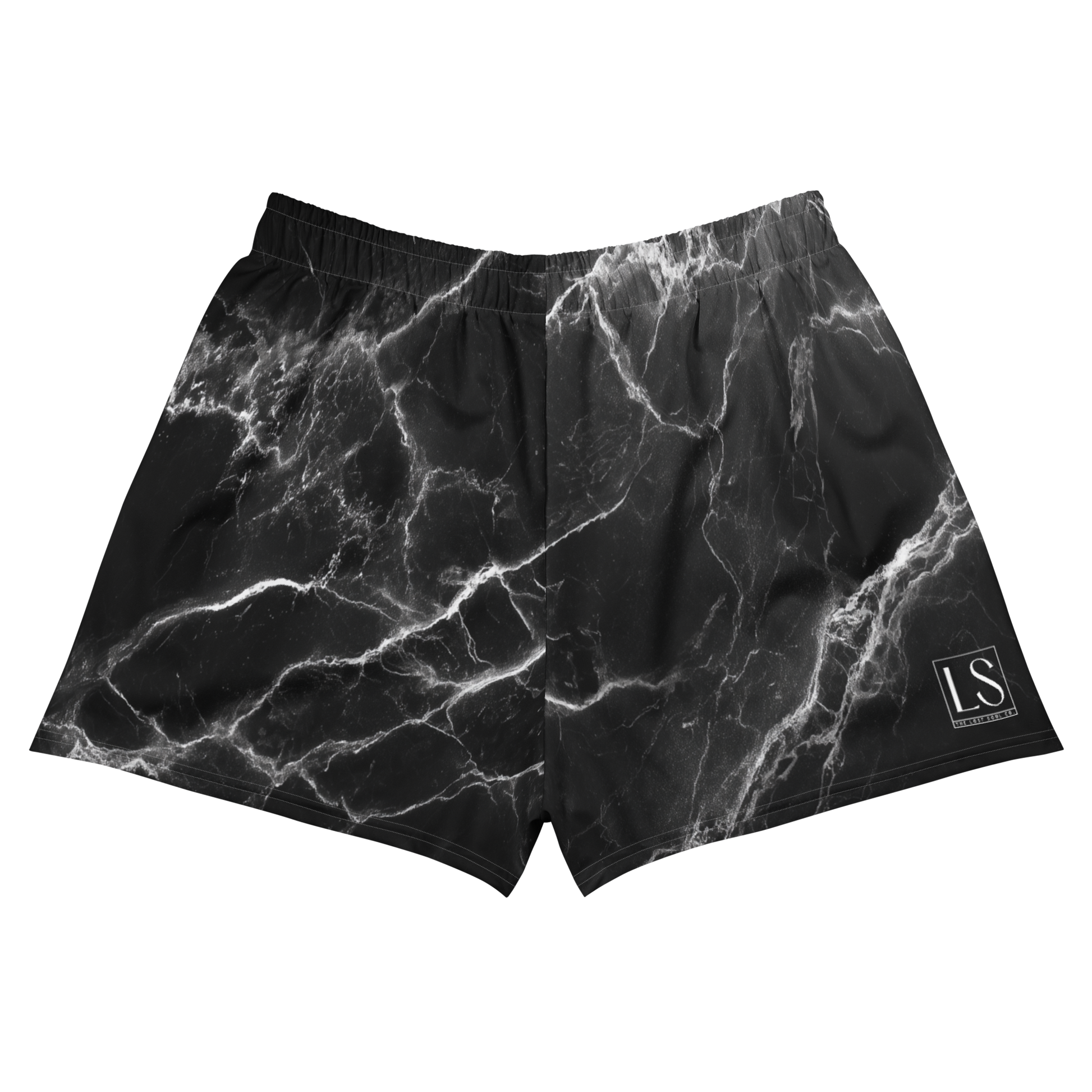 A fractured marble storm splits across both legs — lightning veins drawn in stone.