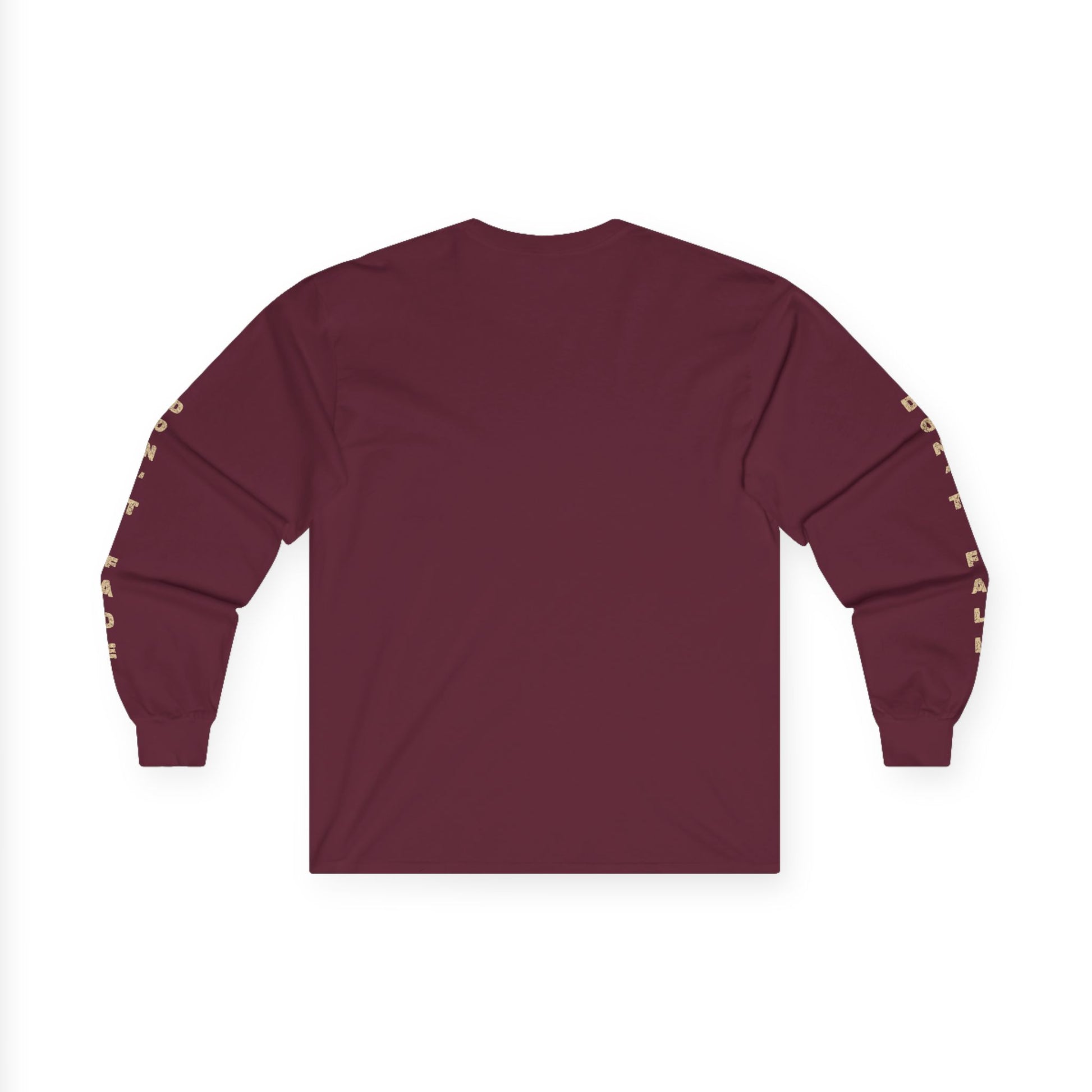 This long sleeve tee features a shattered red heart in the center chest — a symbol of quiet collapse, pain, and survival. On each sleeve, grungy script reads “Don’t Fade” and “Don’t Fall”, balancing vulnerability and resistance.