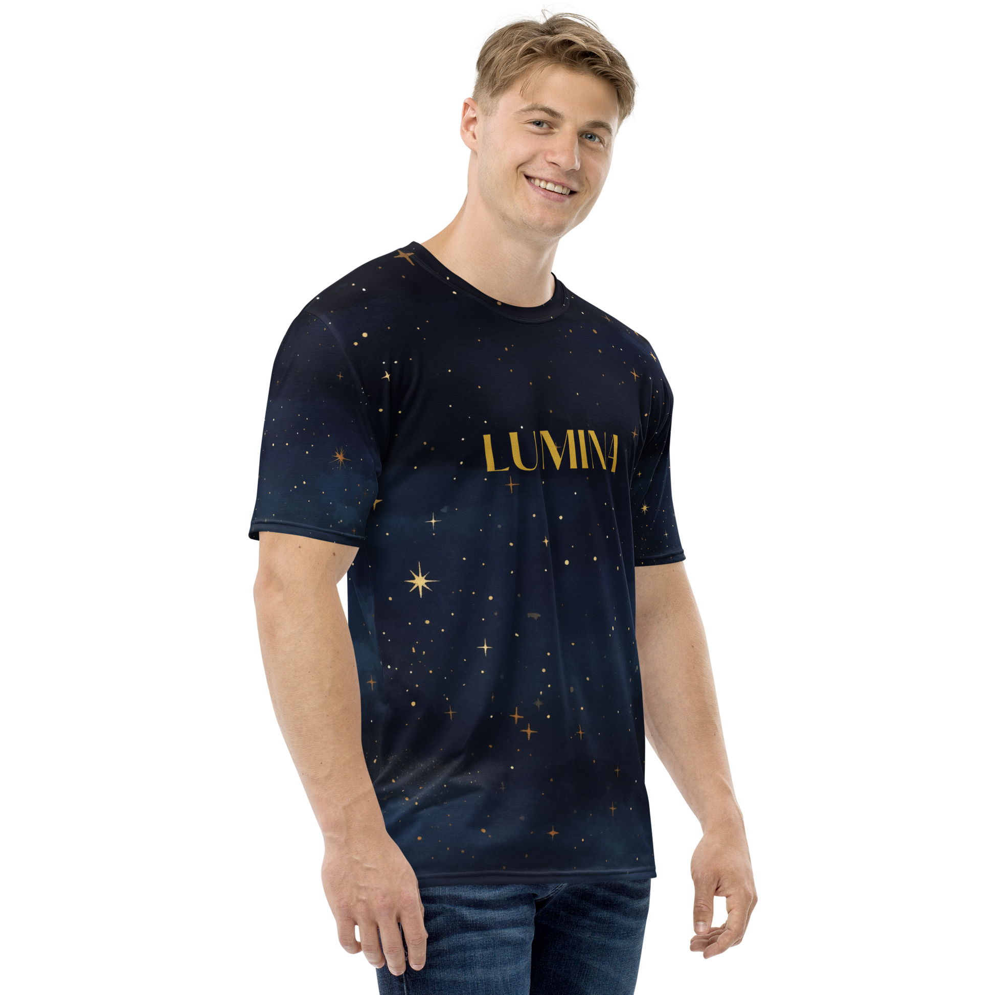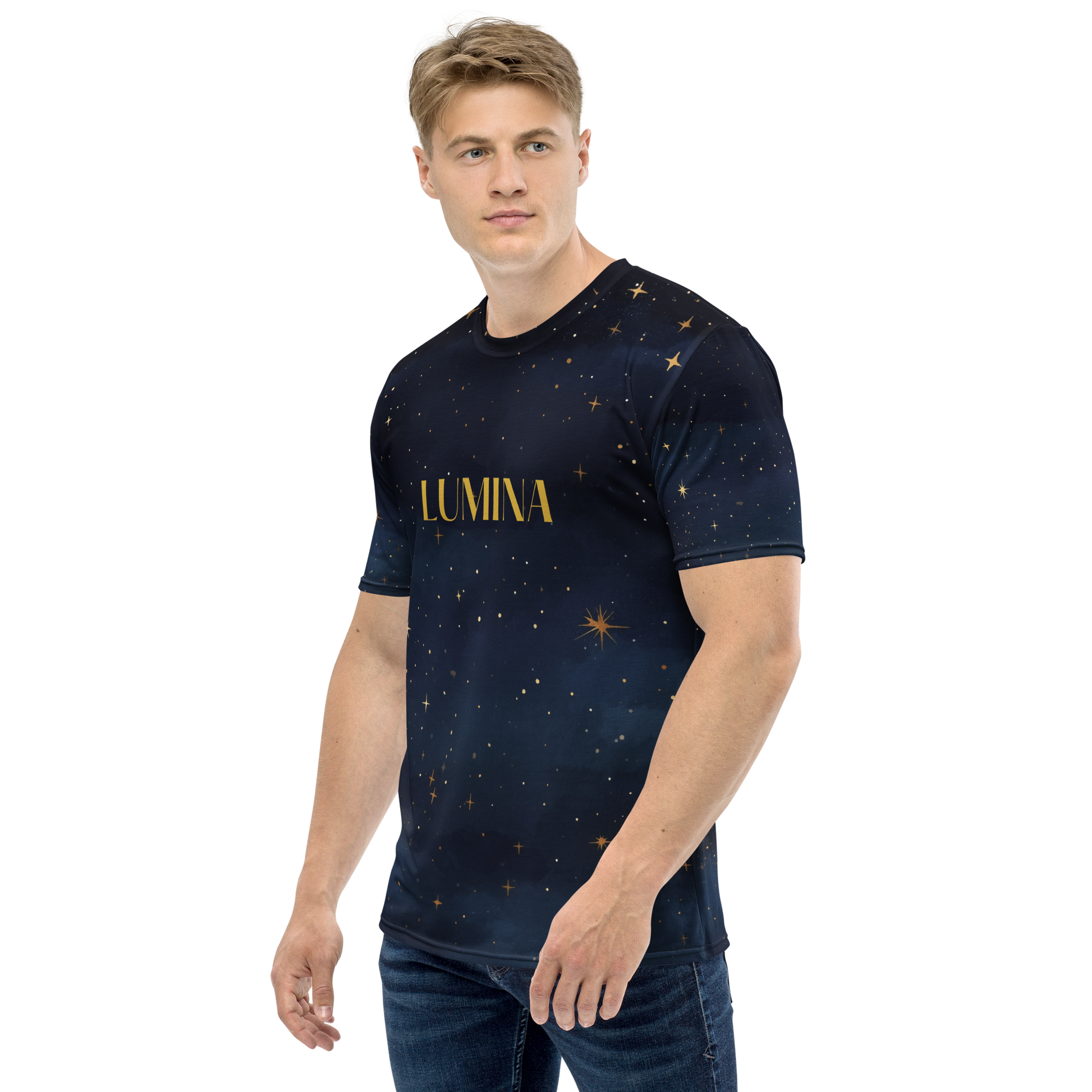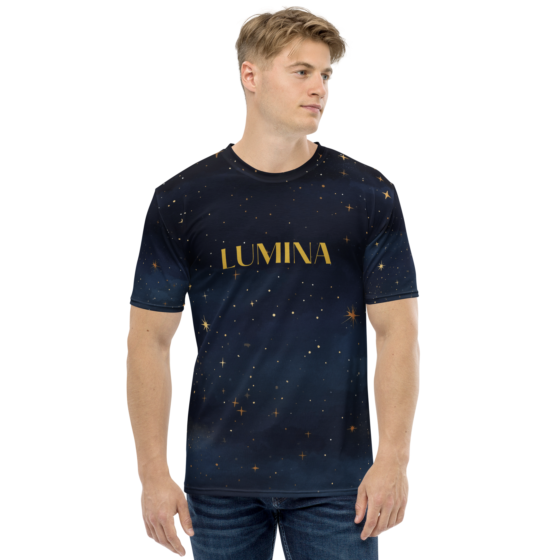 • Design: Deep navy starfield with golden constellations and the word LUMINA at center