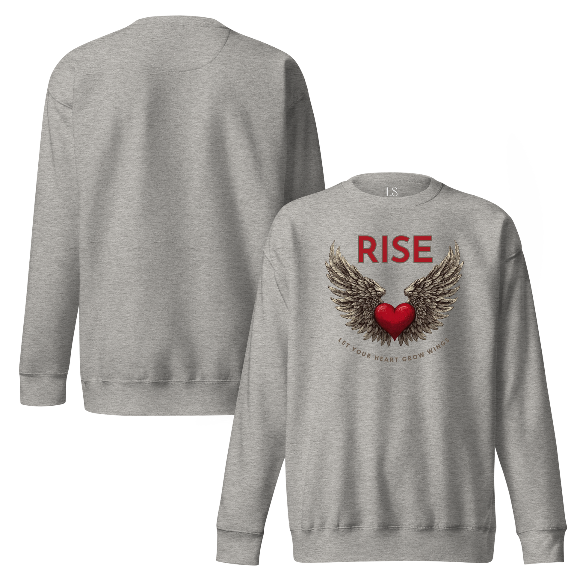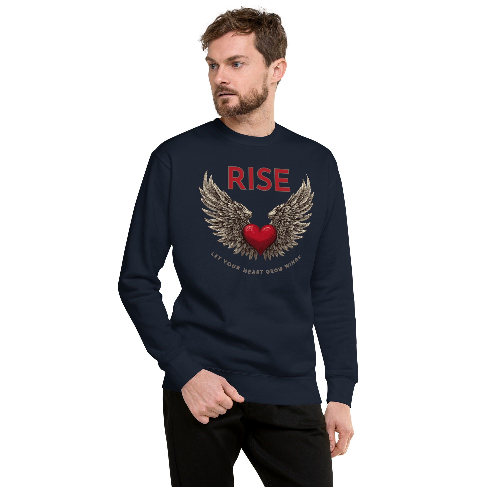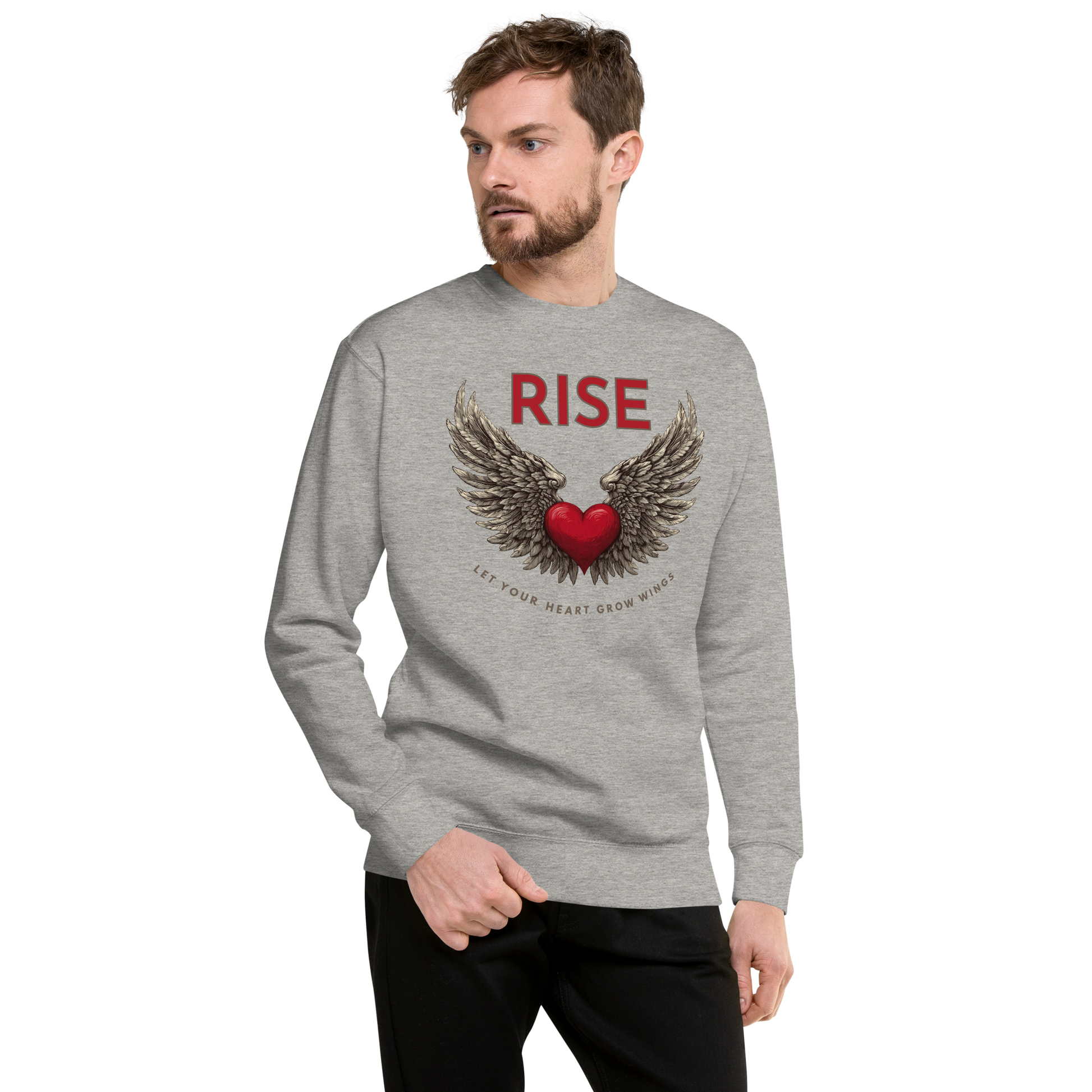 A red heart with detailed wings spreads across the chest, centered beneath the word RISE, with a curved message below that reads Let Your Heart Grow Wings.