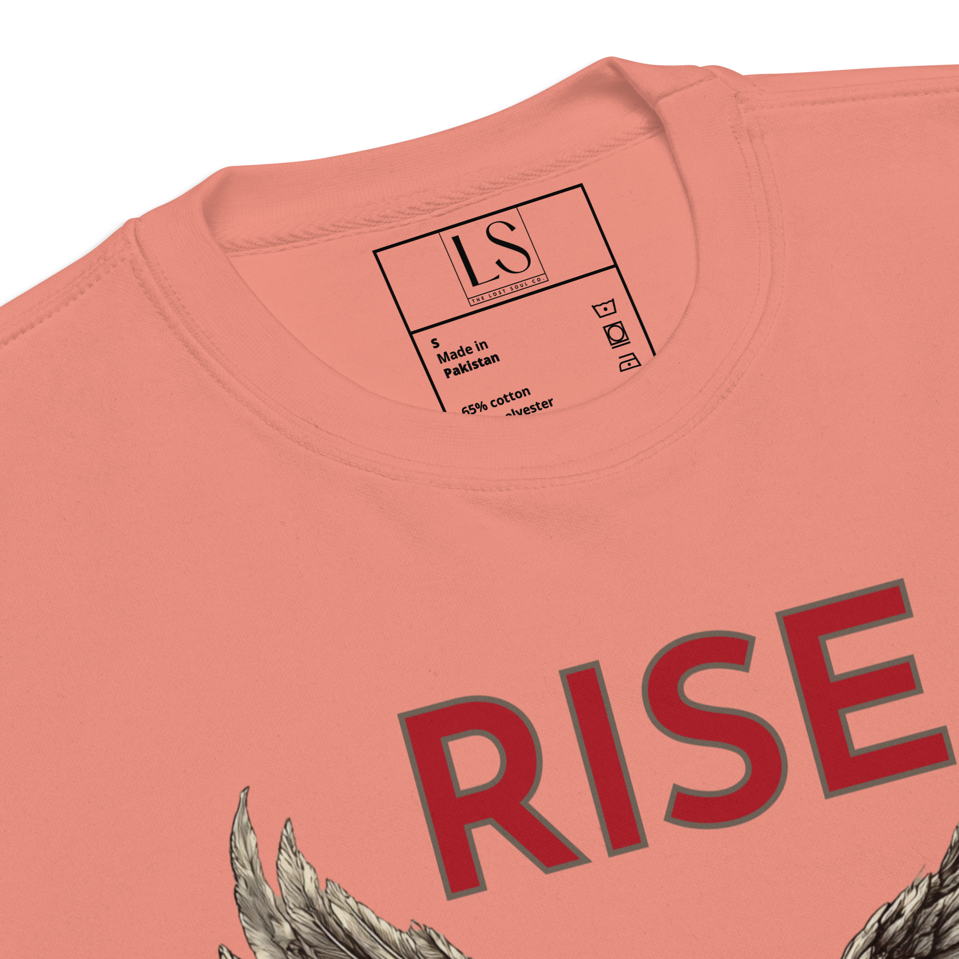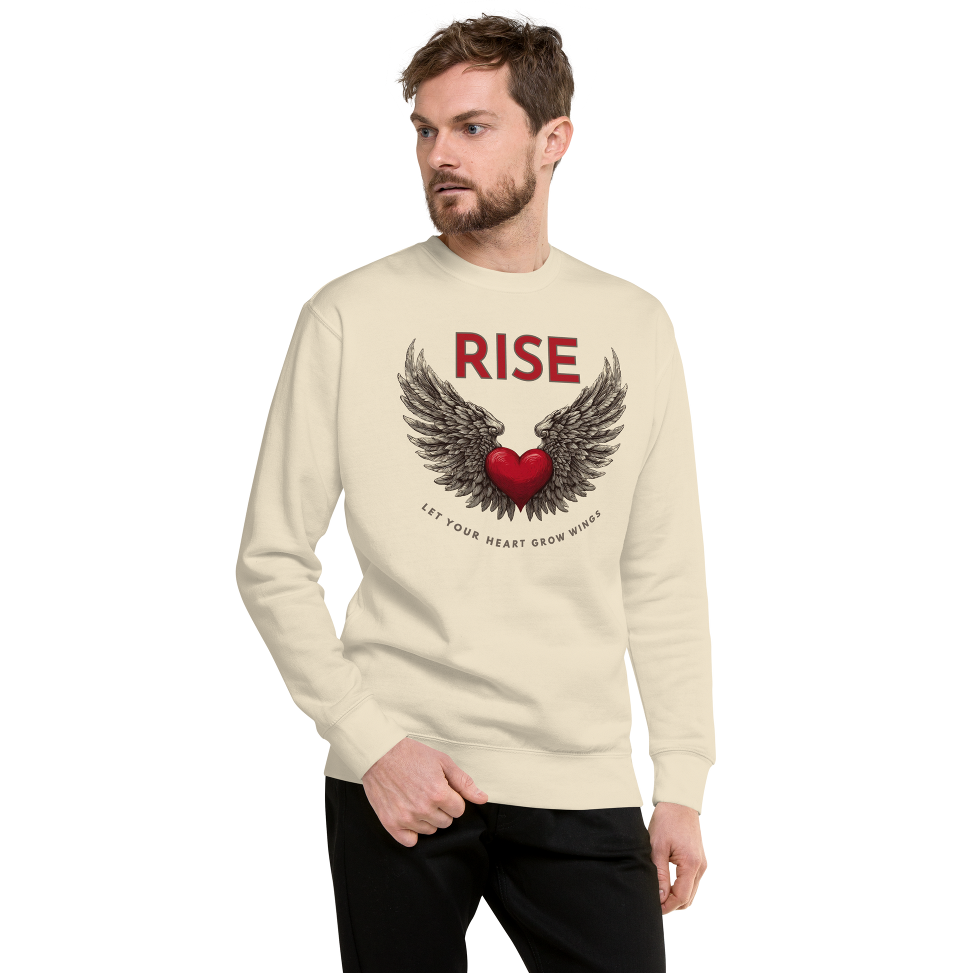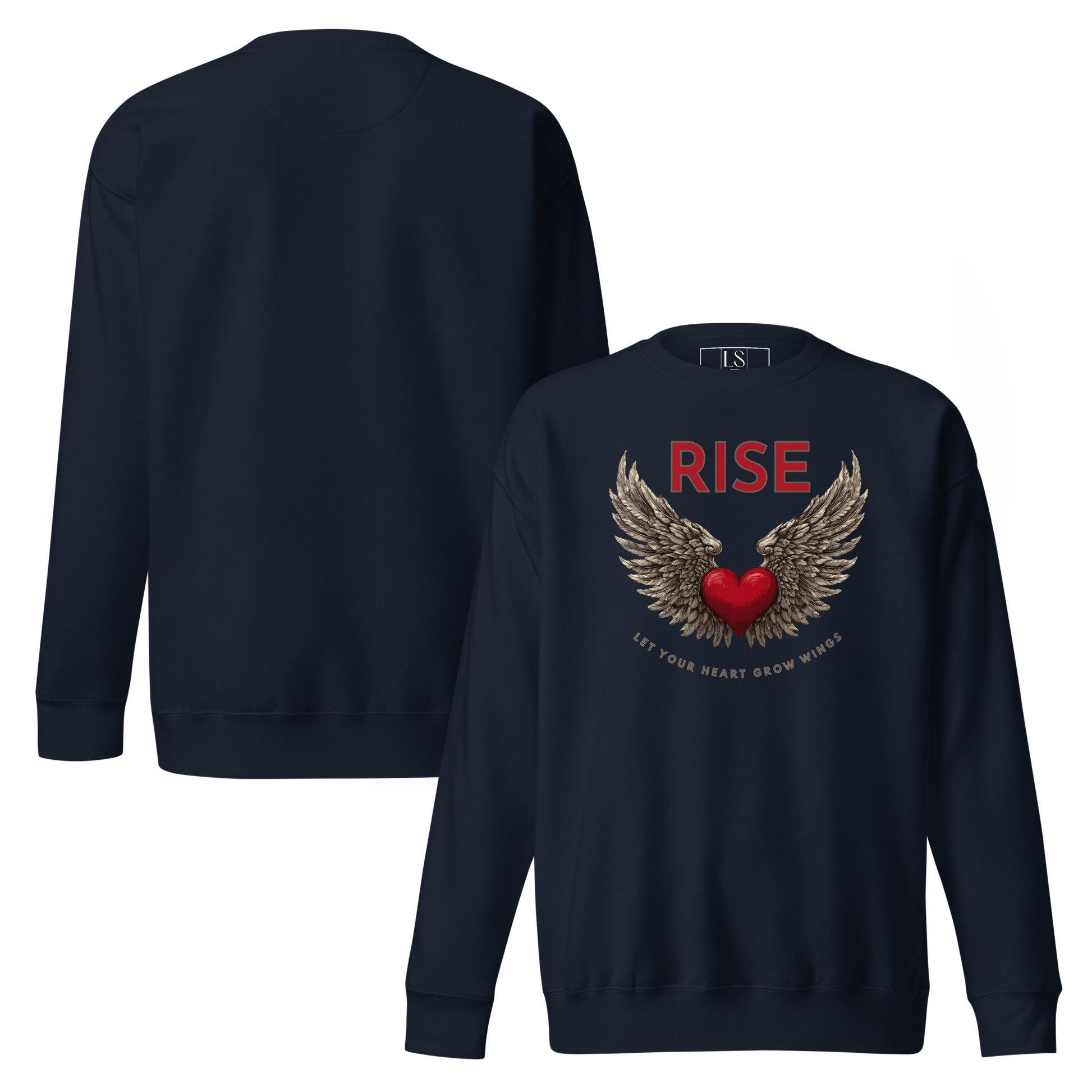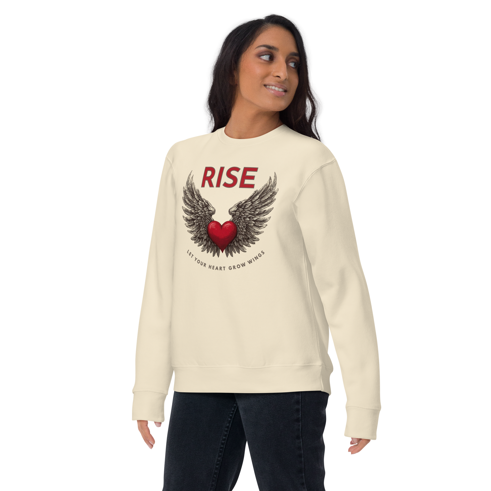 A red heart with detailed wings spreads across the chest, centered beneath the word RISE, with a curved message below that reads Let Your Heart Grow Wings.